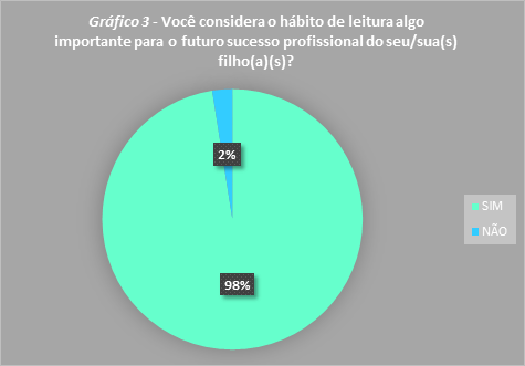 O gráfico 3, com a pergunta “Você considera o hábito da leitura algo importante para o futuro sucesso profissional do seu/sua(s) filho(a)(s)?”, mostra exatamente o que os pais dos alunos da E.M.E.F. Professora Benedita Monteiro, pensam sobre a importância da leitura. (Lembrando que o questionário foi respondido algum tempo depois dos seus filhos receberem os livros). Veja: