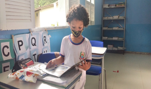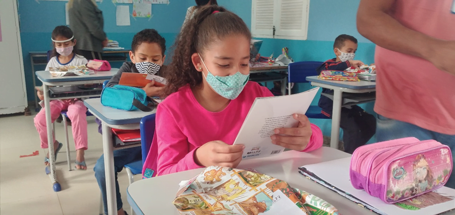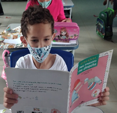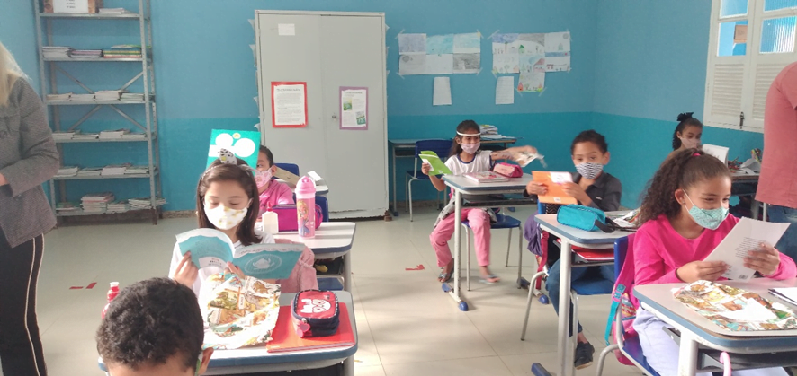 Observe abaixo a expressão facial, o sorriso no olhar da aluna de camisa cor de rosa (apesar da máscara), lendo e se deliciando com o texto do livro que ganhou de presente.