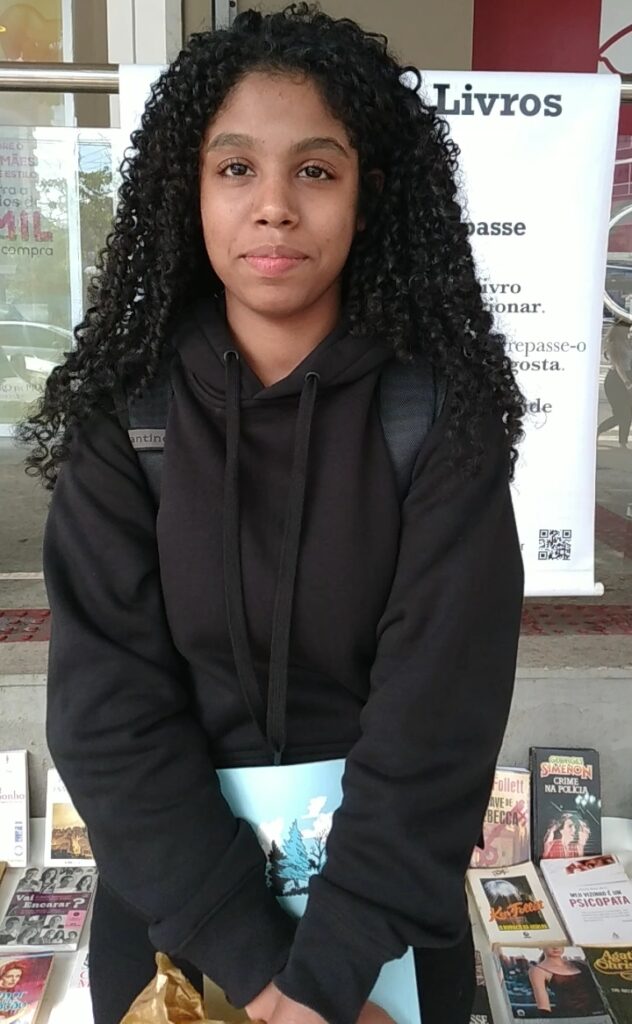 “Oi, eu sou Eloara, eu passo aqui toda terça-feira e pego livro, da última vez eu peguei o livro Jovens Sarados, a galera da minha escola gostou muito do livro, está circulando para outros colegas, todo mundo gostando muito.”